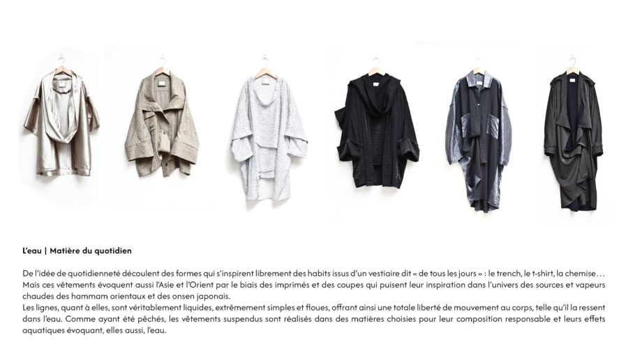 Kim est la première collection élaborée autour de la fluidité. Elle a aussi été le point de départ de ma recherche actuelle portant sur le kimono et la notion de quotidienneté contemporaine. Les matières utilisées pour sa réalisation sont tissées dans les Vosges avec des fils viscose et polyamide produits de manière écologique en Allemagne. La viscose, fabriquée à partir de pulpe de bois, est donc issue d’une matière naturelle. Quant au polyamide, savamment tissé sur l’endroit de la matière, il confère aux vêtements de subtils chatoiements.