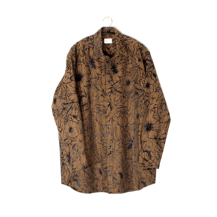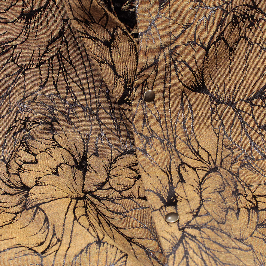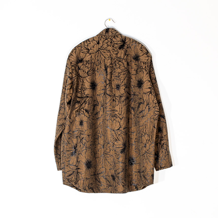 Gender-neutral shirt handcrafted in my workshop in an oeko tex certified cotton jacquard with contrasting and finely sparkling large floral pattern. Back yoke and a pleat for ease. Easy-going piece that can be worn buttoned in a classic way or open as an over-shirt version. The closure is made with small aged gold metal-looking press studs.