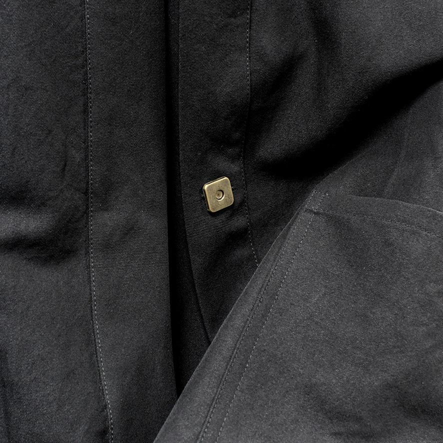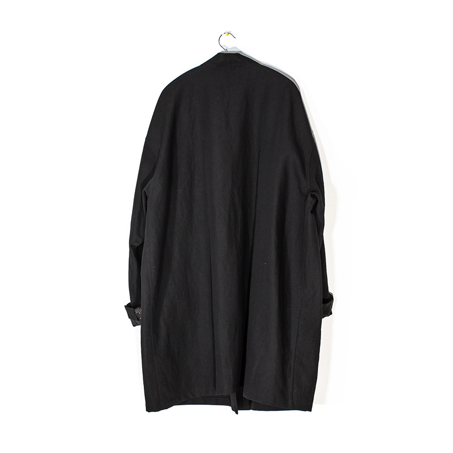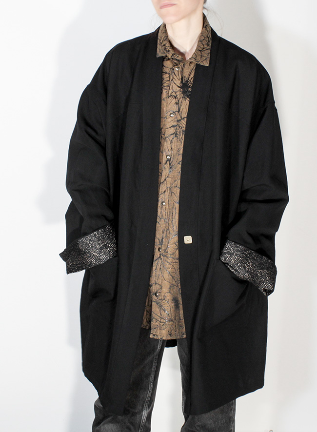 Forme ample avec revers coordonnés et col kimono fini au point main. Veste réalisée à l’atelier avec une matière tissée au japon et issue de surstocks.